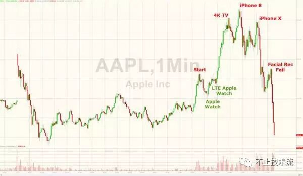 好在第二次顺利解锁,这兄弟在后面还刻意多演示了几次顺利解锁以做弥补。可是资本市场貌似并不买帐,开锁失败的那一刻苹果股价明显下跌。
